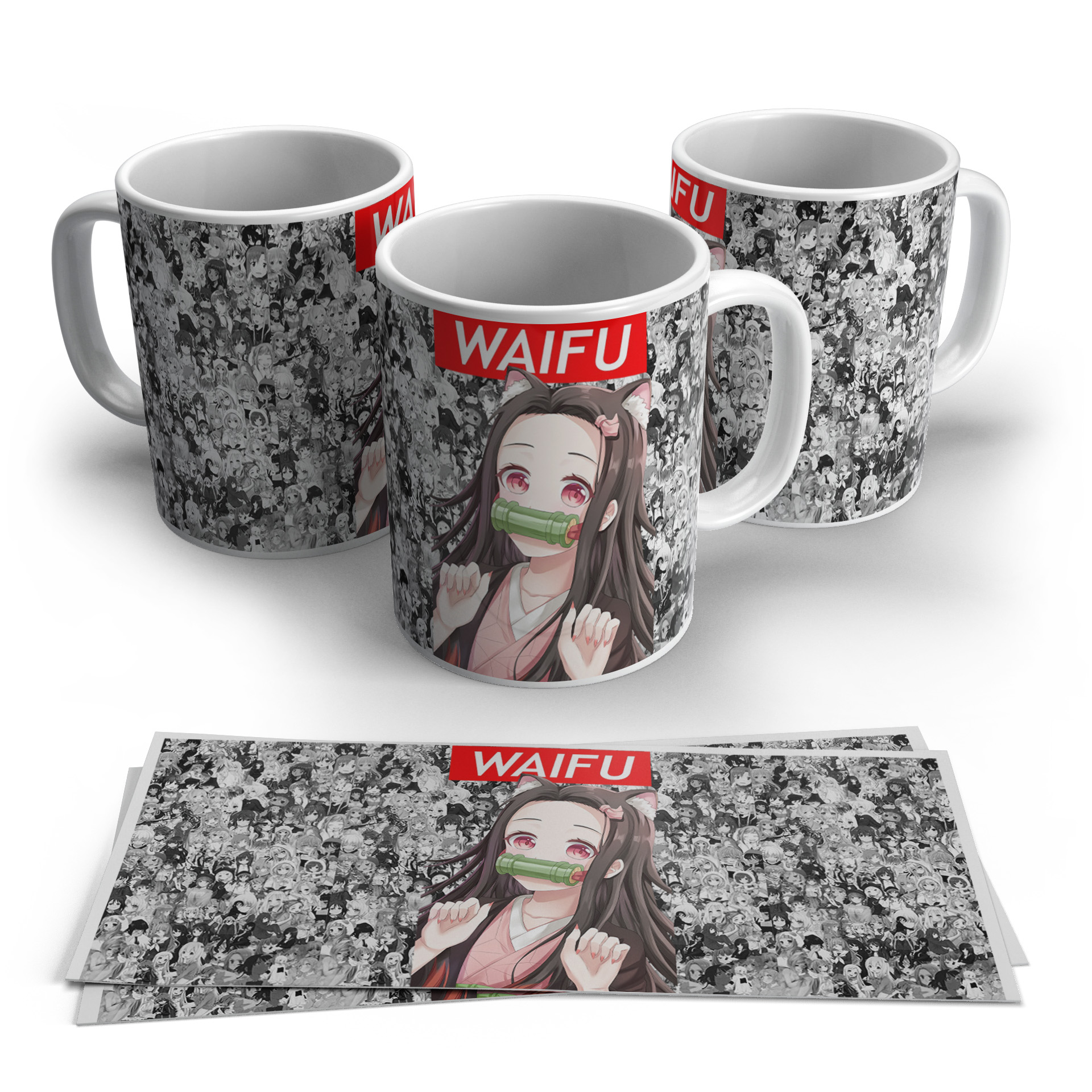 ₹249.00A cute waifu mug with cat-style anime character, bold red accent and detailed manga collage background, perfect for anime fans.