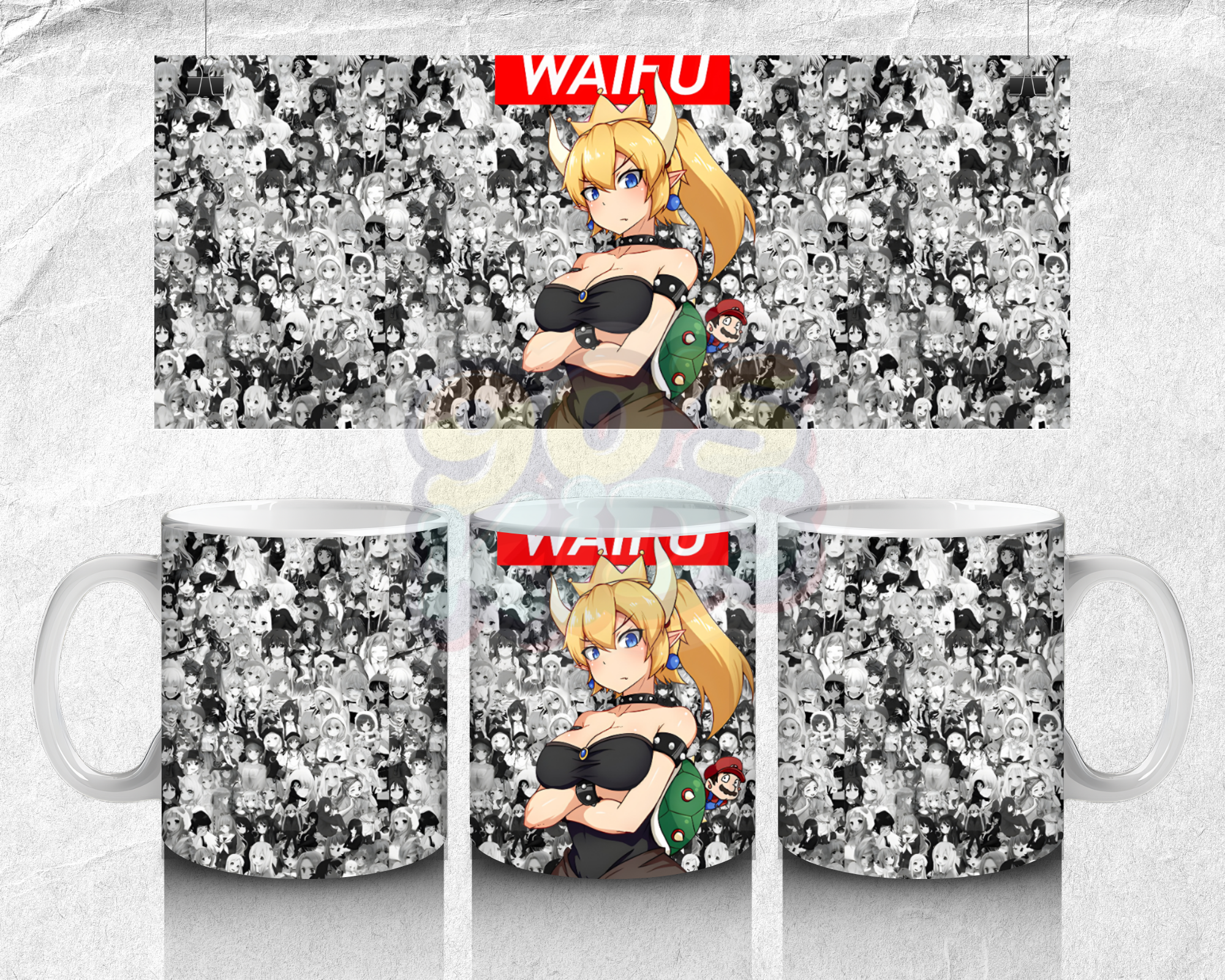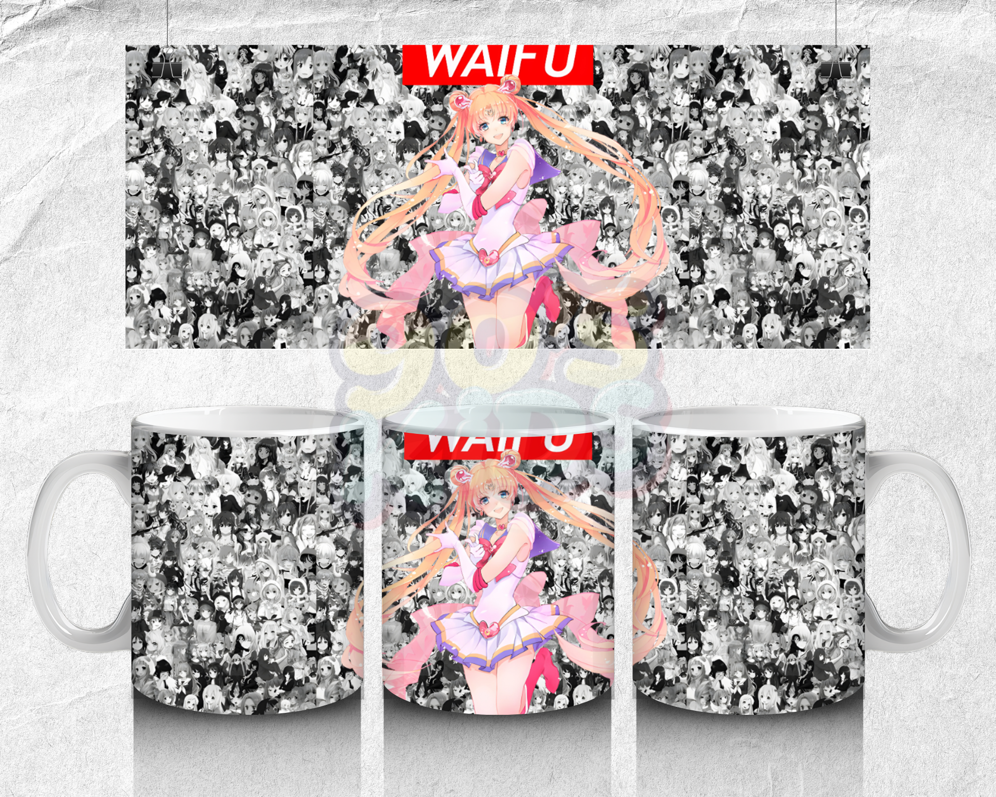 Stylish waifu anime mug with blonde warrior design and manga collage background, perfect for anime fans.