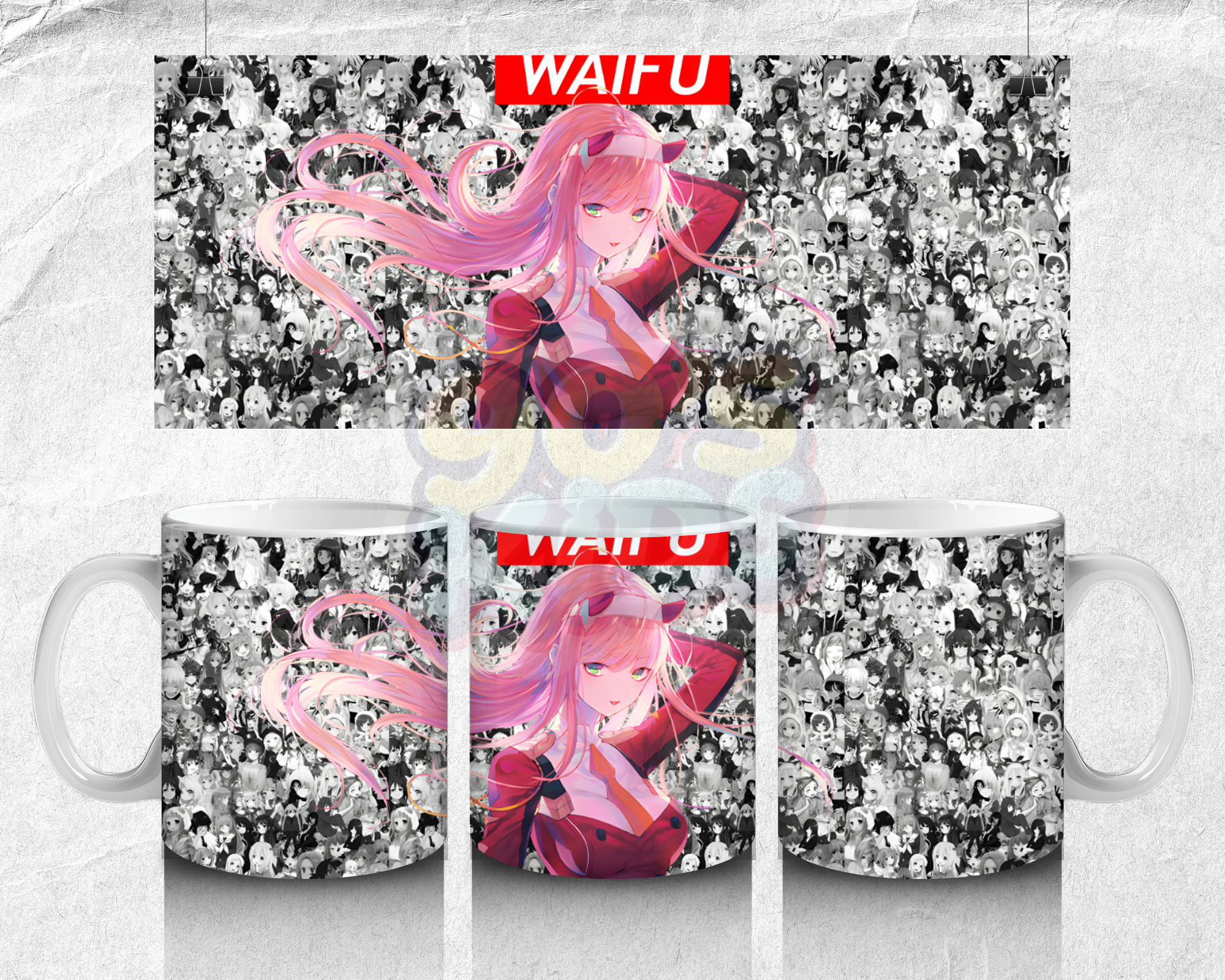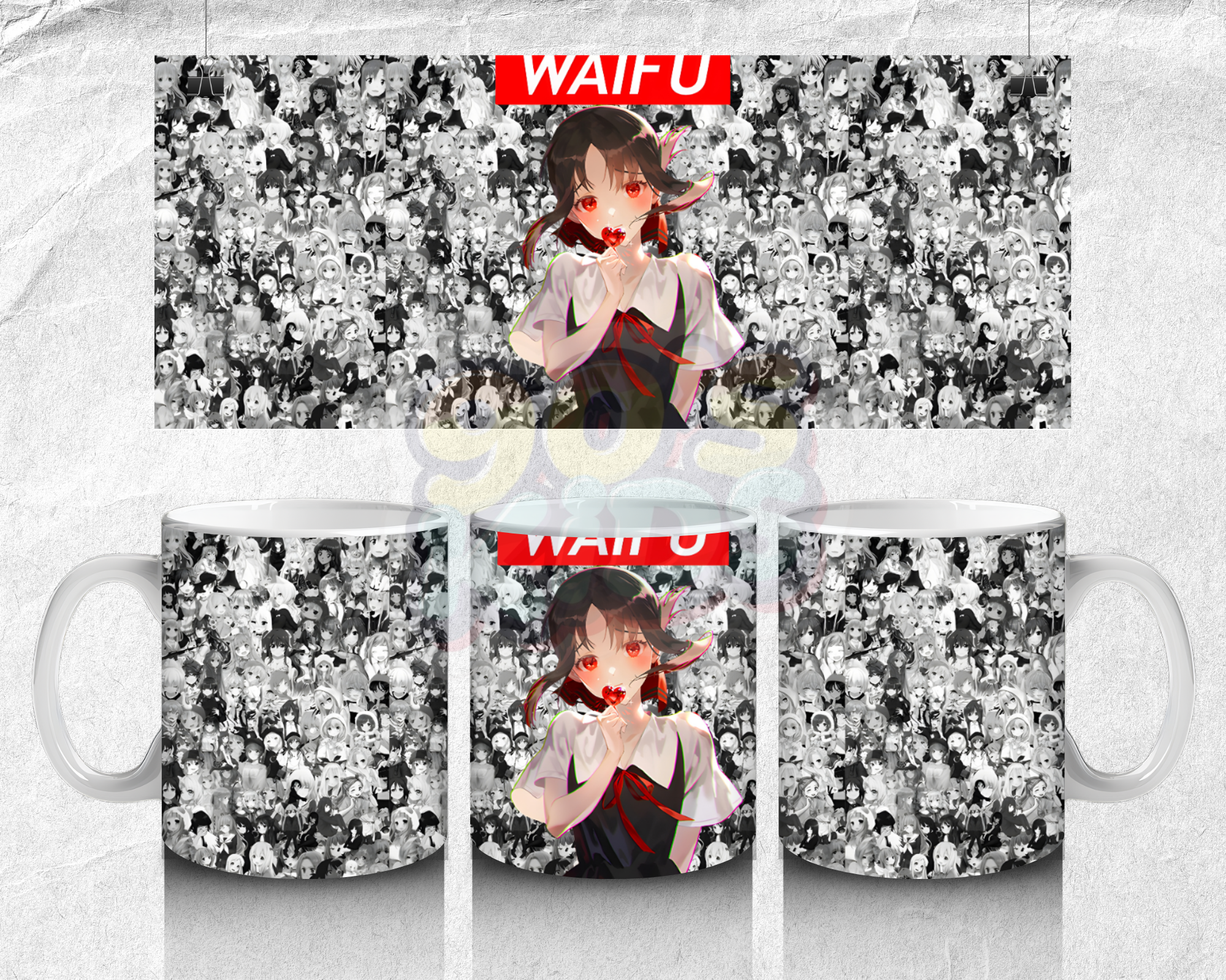 Stylish pink waifu anime mug with bold aesthetic design and manga background, perfect for anime lovers who like trendy and eye-catching styles.