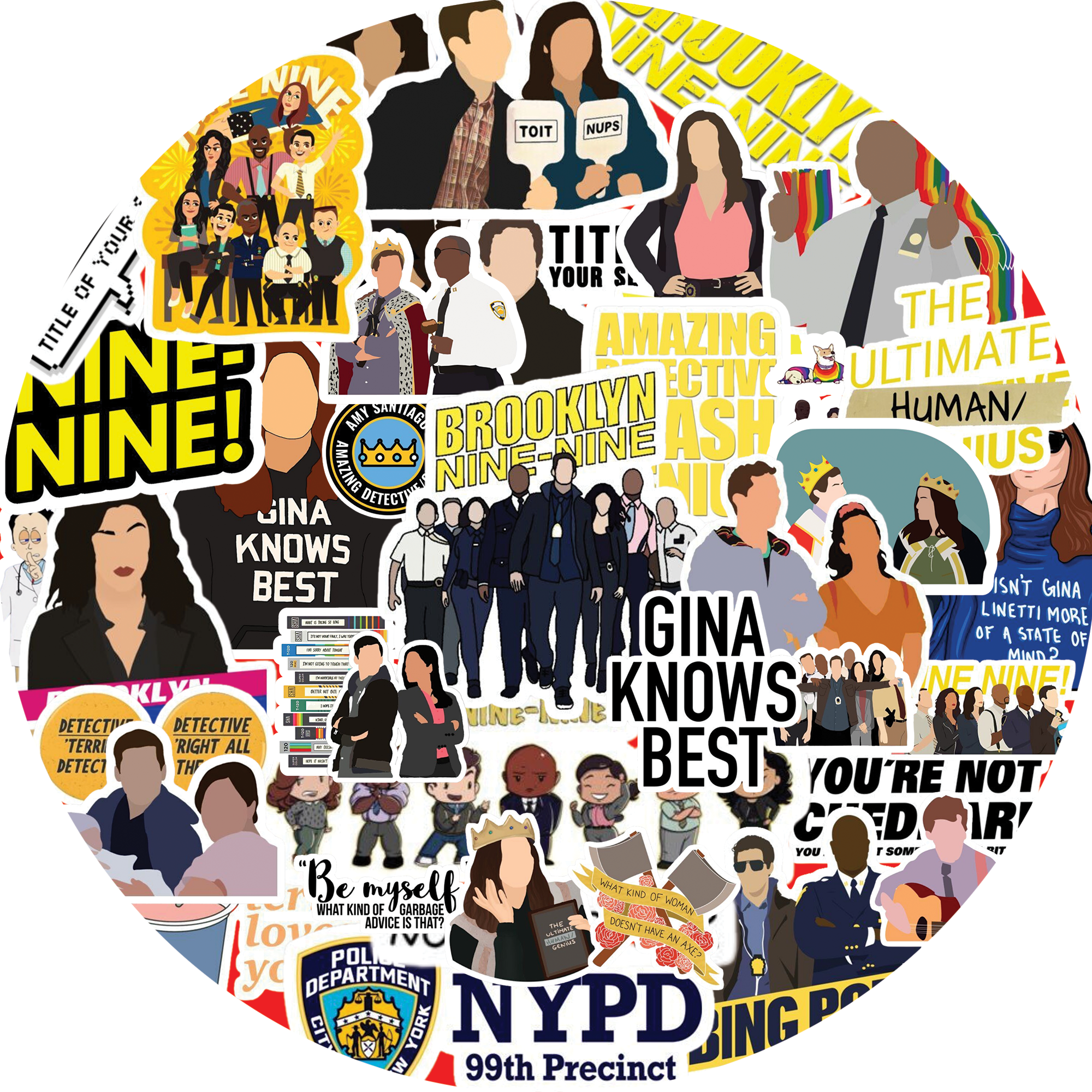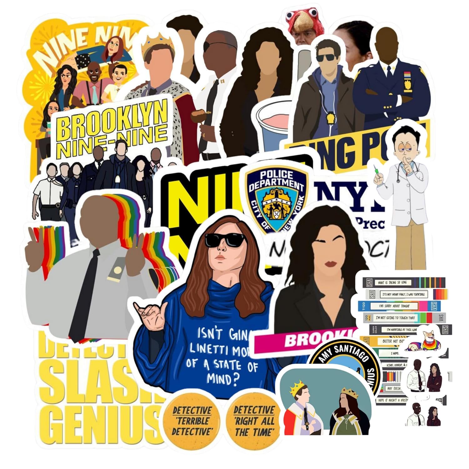 Set of 50 Brooklyn Nine Nine stickers featuring Captain Ray Holt, Amy Santiago, Detective Rosa Diaz, Gina Linetti, Detective Jake Peralta, Charles Boyle. These stickers are crafted out of love with High quality Ink. In order to enure optimum longivity we’ve laminated them with High quality meterial. This should help promote resitance to water, fading, minor scratches. The gum is highly adhesive forming a very strong bond with any flat, plain and even dirt free surface. The adhesive is made of premium quality meterial to ensure it leaves little to no resedue for reapplication. Feel appretiated for your sticker collection. Apply it to your laptop or phone, Journal or notbook, Study table or Door, Fridge or Ac, Bicycle or Bike, the possibility of customization is endless and we would love to be a part of it.