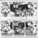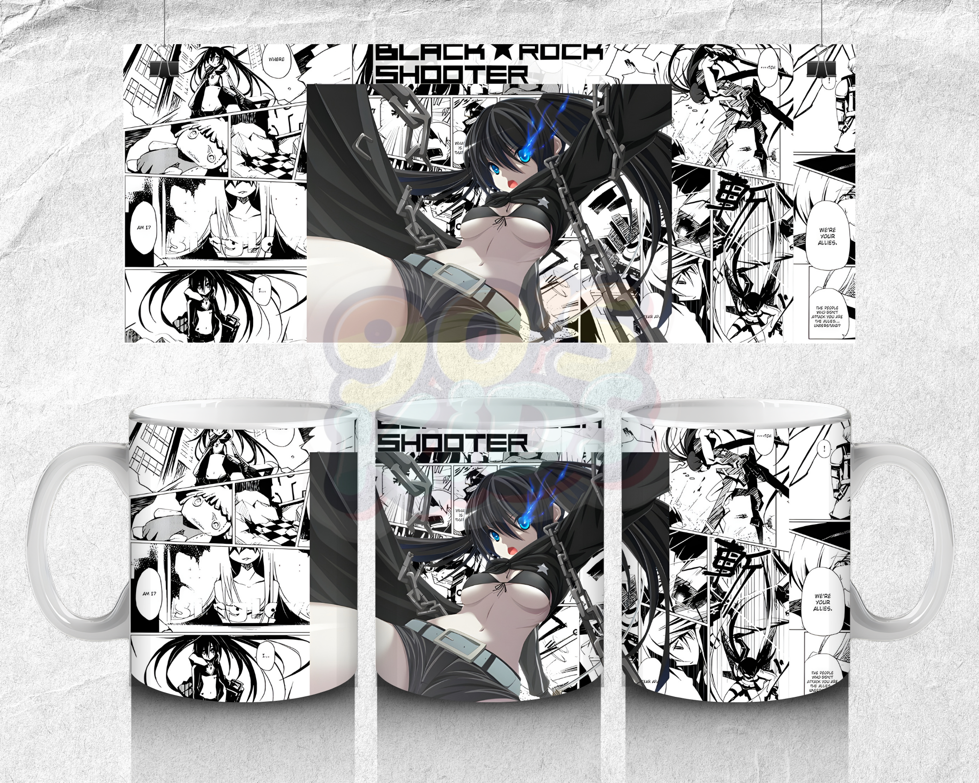 This mug features Black Rock Shooter in a bold action pose with signature blue flame eye detail.