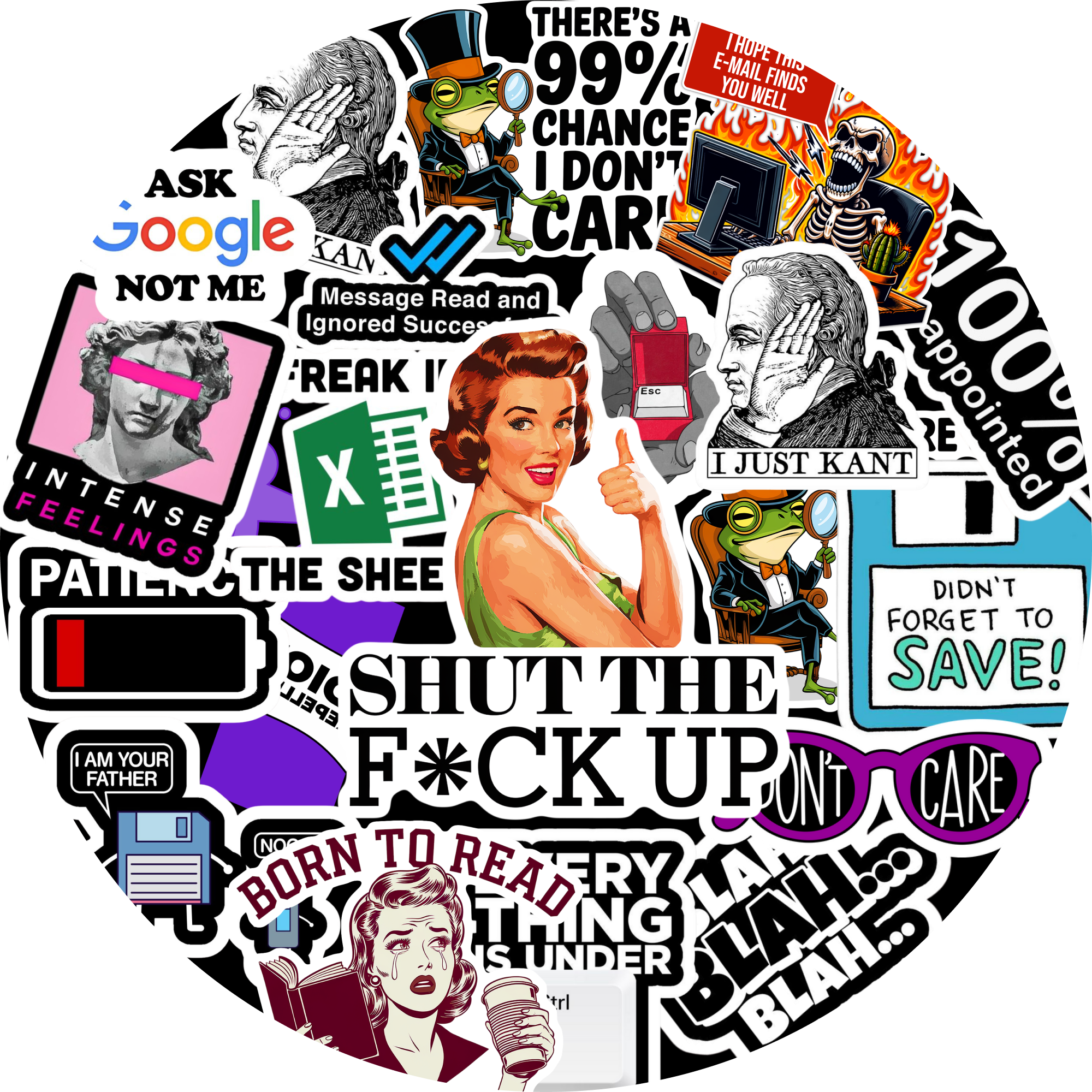 Express your online personality in the real world with this vibrant collection of internet culture sticker decals! This pack features a nostalgic mix of retro-style pop culture references, classic memes, witty phrases, and iconic imagery that will transform your laptop, water bottle, or any smooth surface into a statement piece. The collection includes vintage-inspired illustrations, popular internet catchphrases, and humorous graphics that perfectly capture the essence of digital culture. Each vinyl sticker is designed for durability and easy application, making them perfect for personalising your belongings. The pack includes various sizes of stickers featuring memorable quotes, classic computing references, and stylized artwork in a diverse colour palette. Whether you’re a tech enthusiast, meme connoisseur, or simply looking to add some personality to your devices, these high-quality vinyl decals are sure to spark conversations and showcase your unique style. Transform your everyday items into conversation starters with these eye-catching, pop-culture inspired designs that celebrate the fun and quirky side of internet culture.