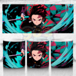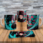 This mug features Tanjiro Kamado in an intense water breathing action pose with flowing blue waves.