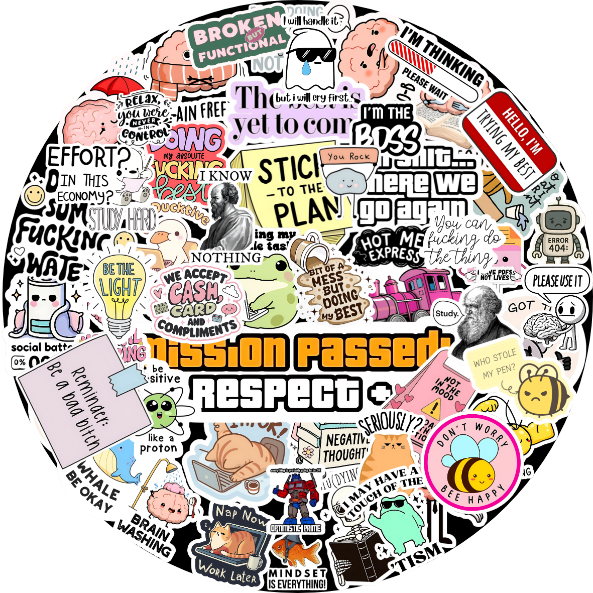 • PACK CONTENTS: 50+ unique brain-themed vinyl stickers featuring motivational quotes, cute characters, and humorous expressions for personalising your belongings
