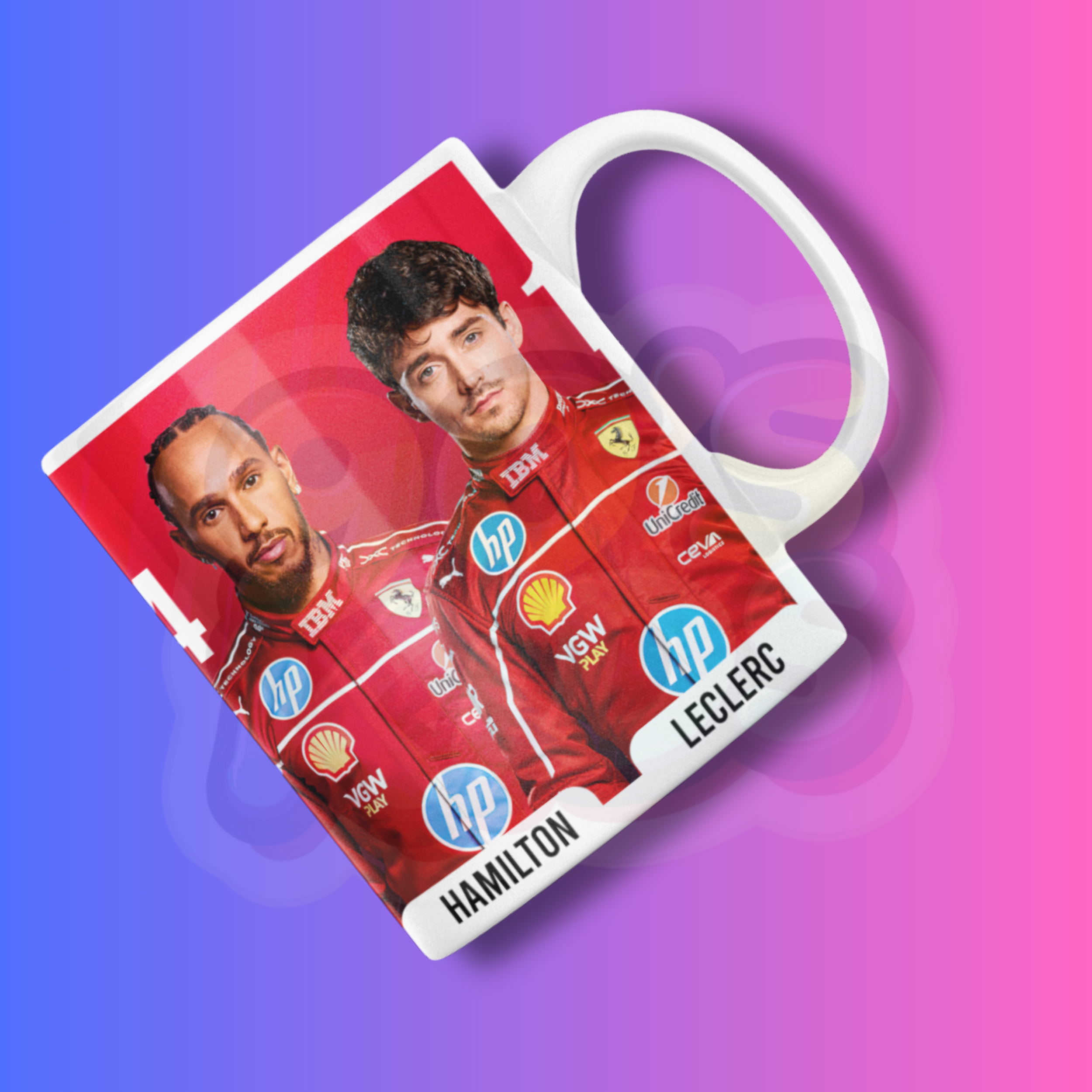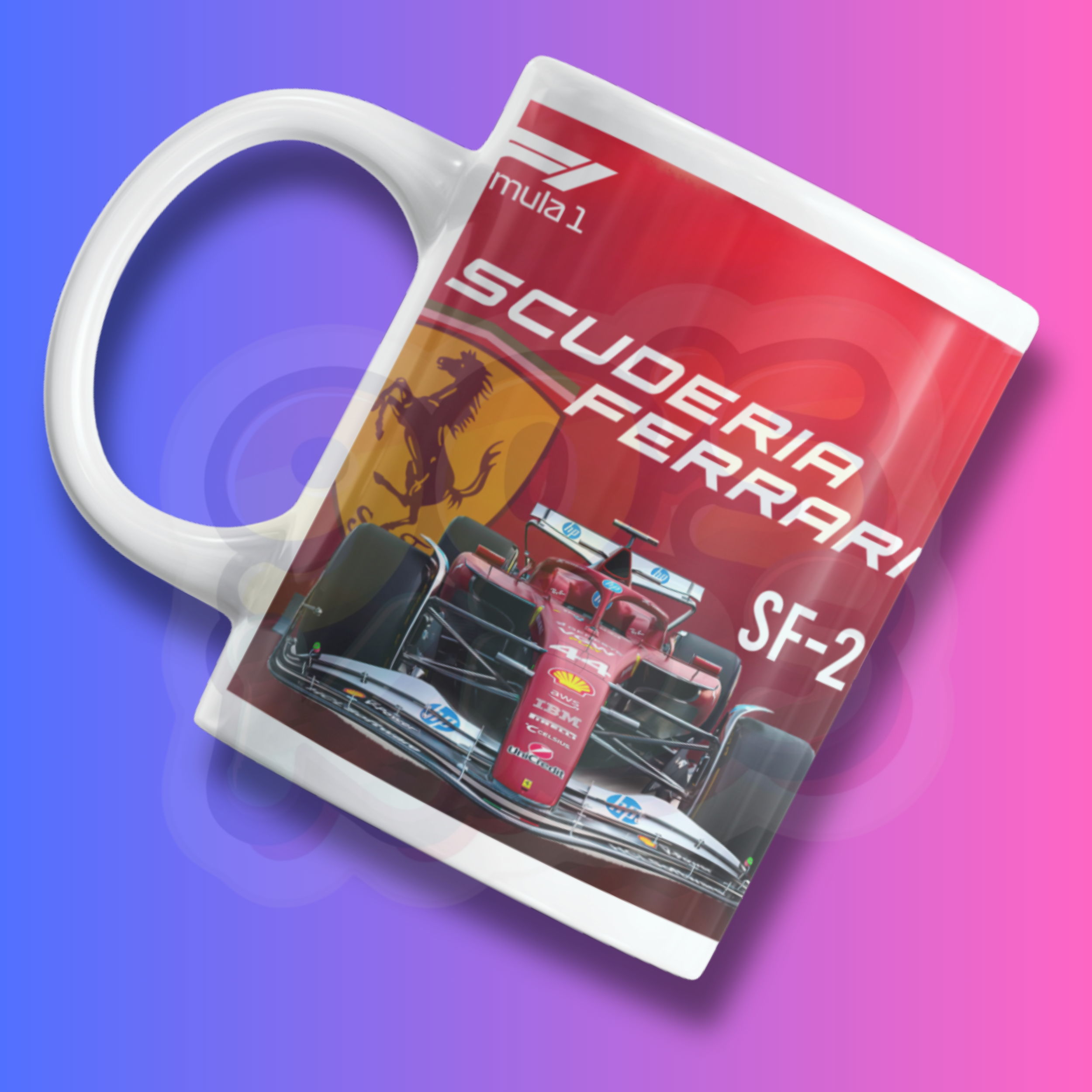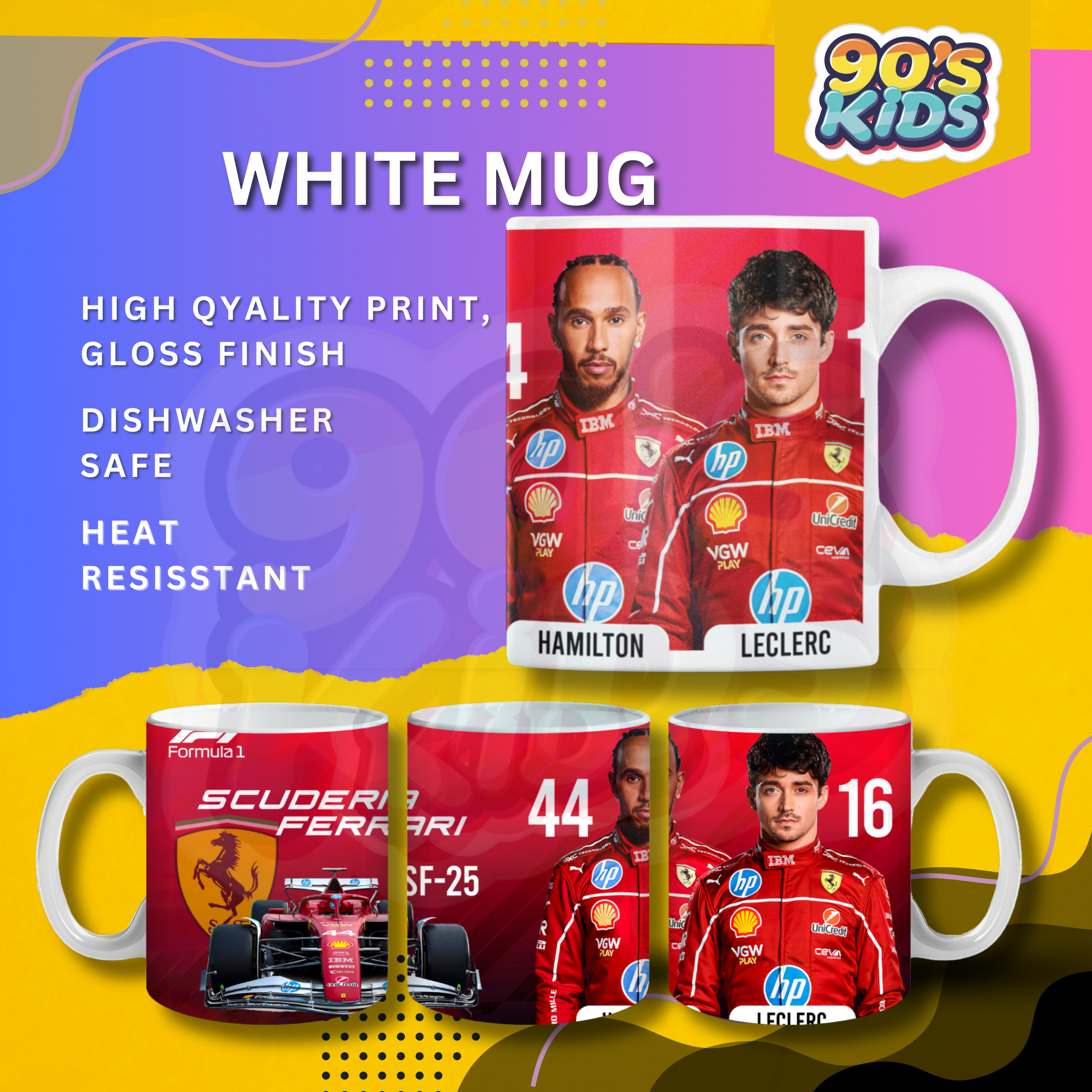 This mug has a cool Ferrari Formula 1 racing design with drivers print. It looks sporty and stylish. The mug is made from ceramic and is good for tea, coffee or milk. It is easy to hold and perfect for daily use at home or office.