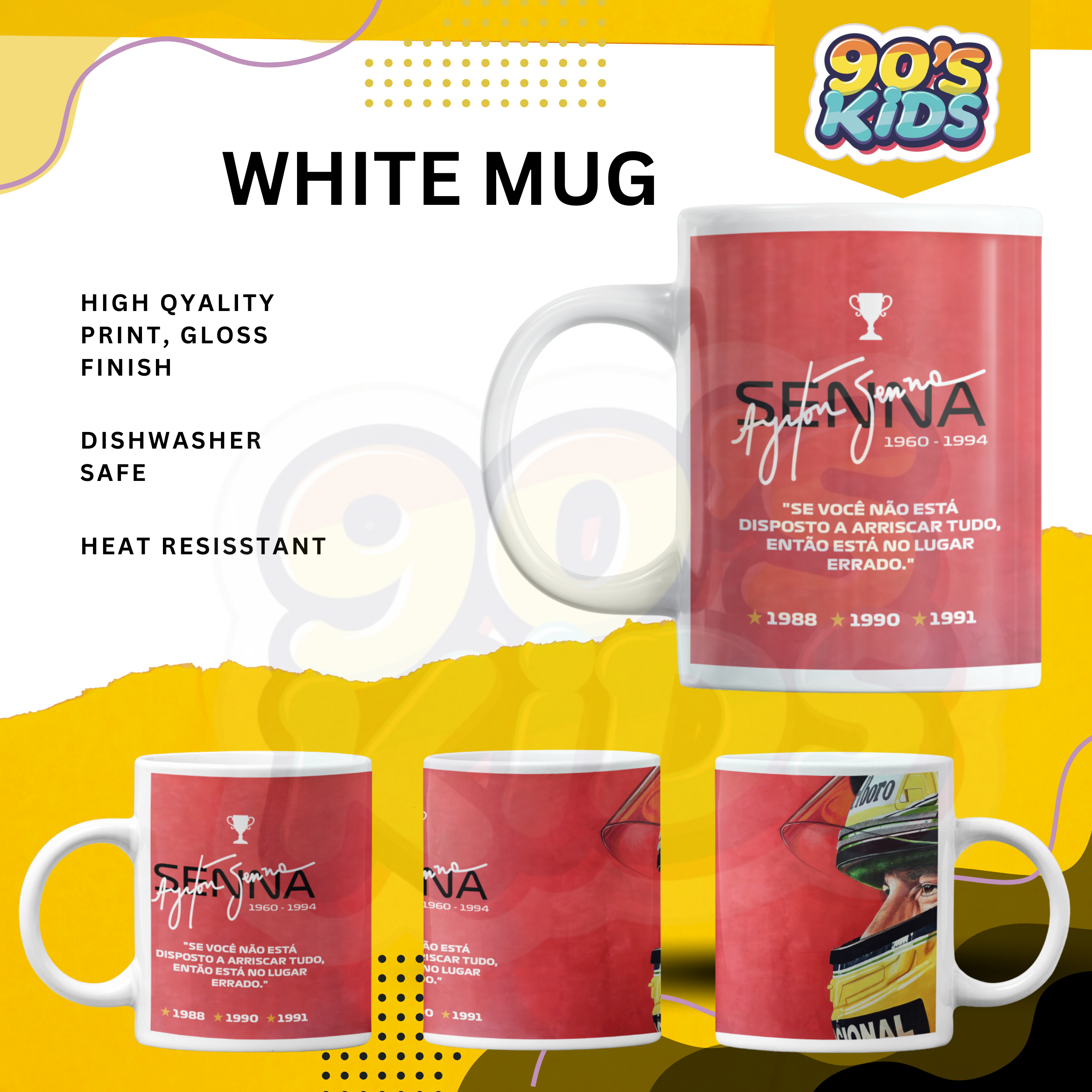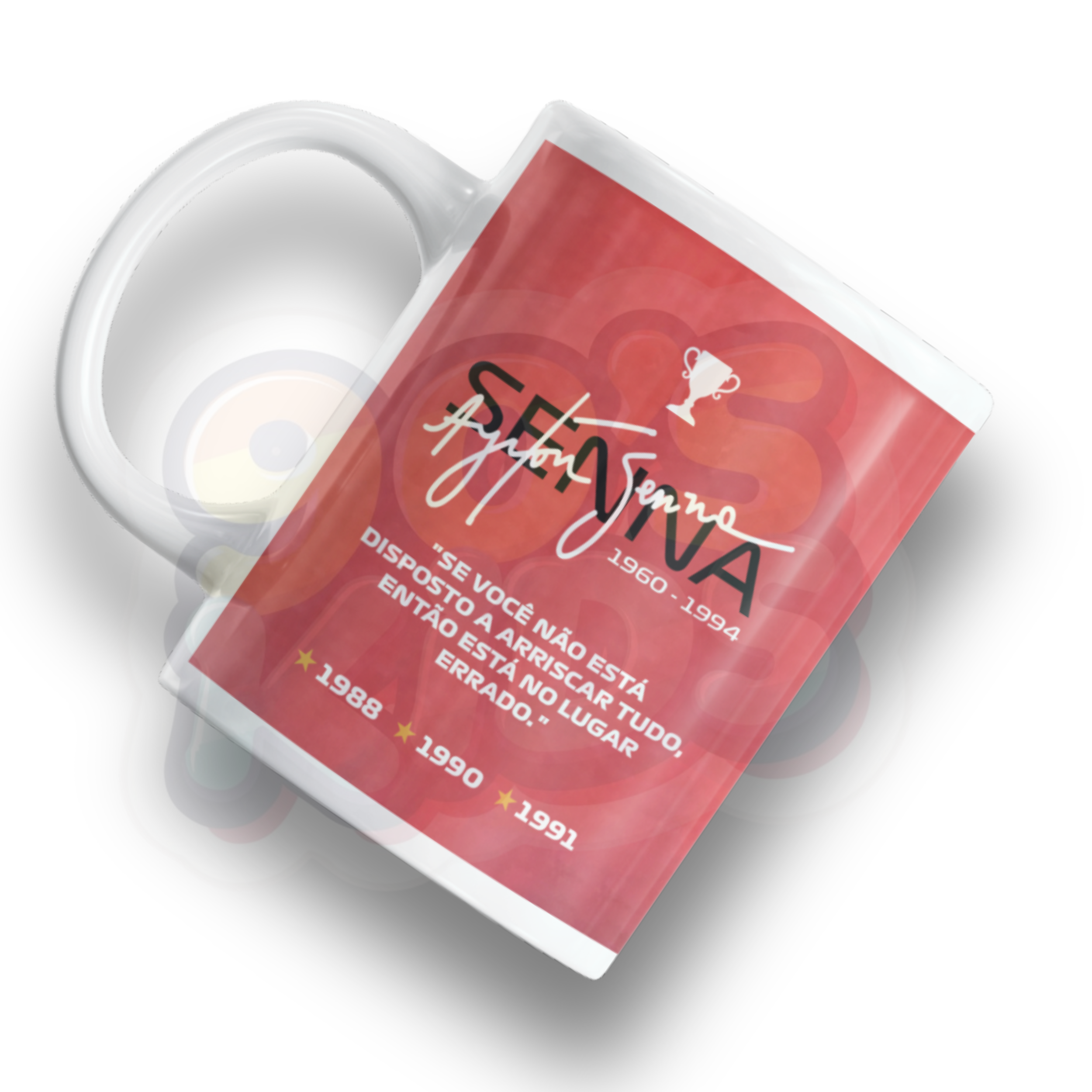 This mug shows a tribute design of Ayrton Senna with a red theme and racing style print. It looks simple and powerful. The mug is made from ceramic and is good for tea, coffee or milk. It is easy to use and perfect for daily routine.