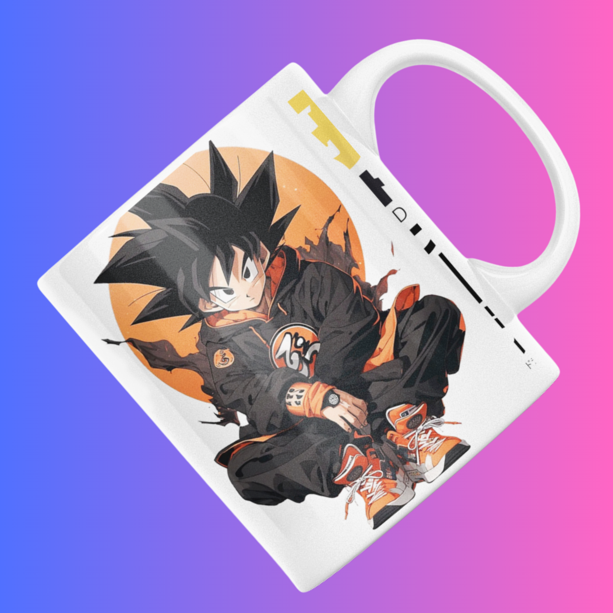 This mug shows Goku in a cool modern anime style with orange and black design. It looks stylish and unique. The mug is made from ceramic and is perfect for tea, coffee or milk. It is simple to use and good for daily use.