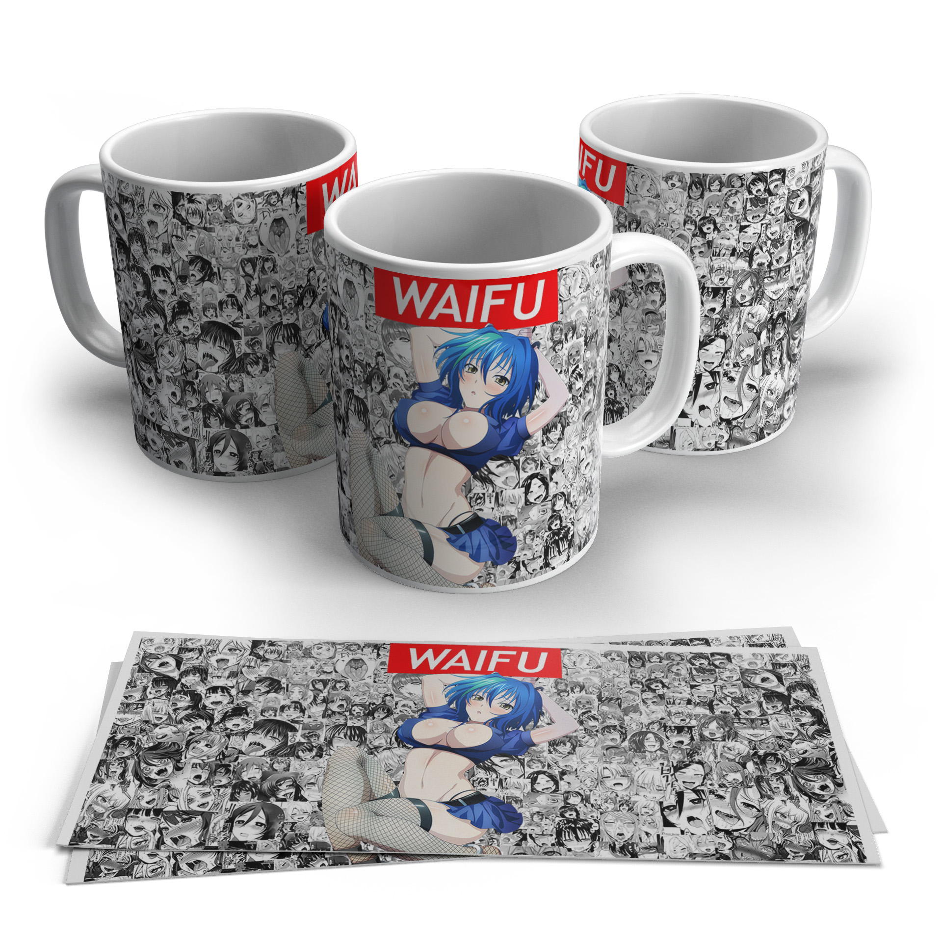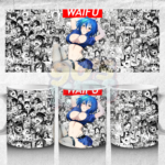 This mug presents a striking blue-haired waifu design that catches attention instantly. The manga collage background adds depth and makes the overall look more stylish. A great pick for anime fans who like standout designs.