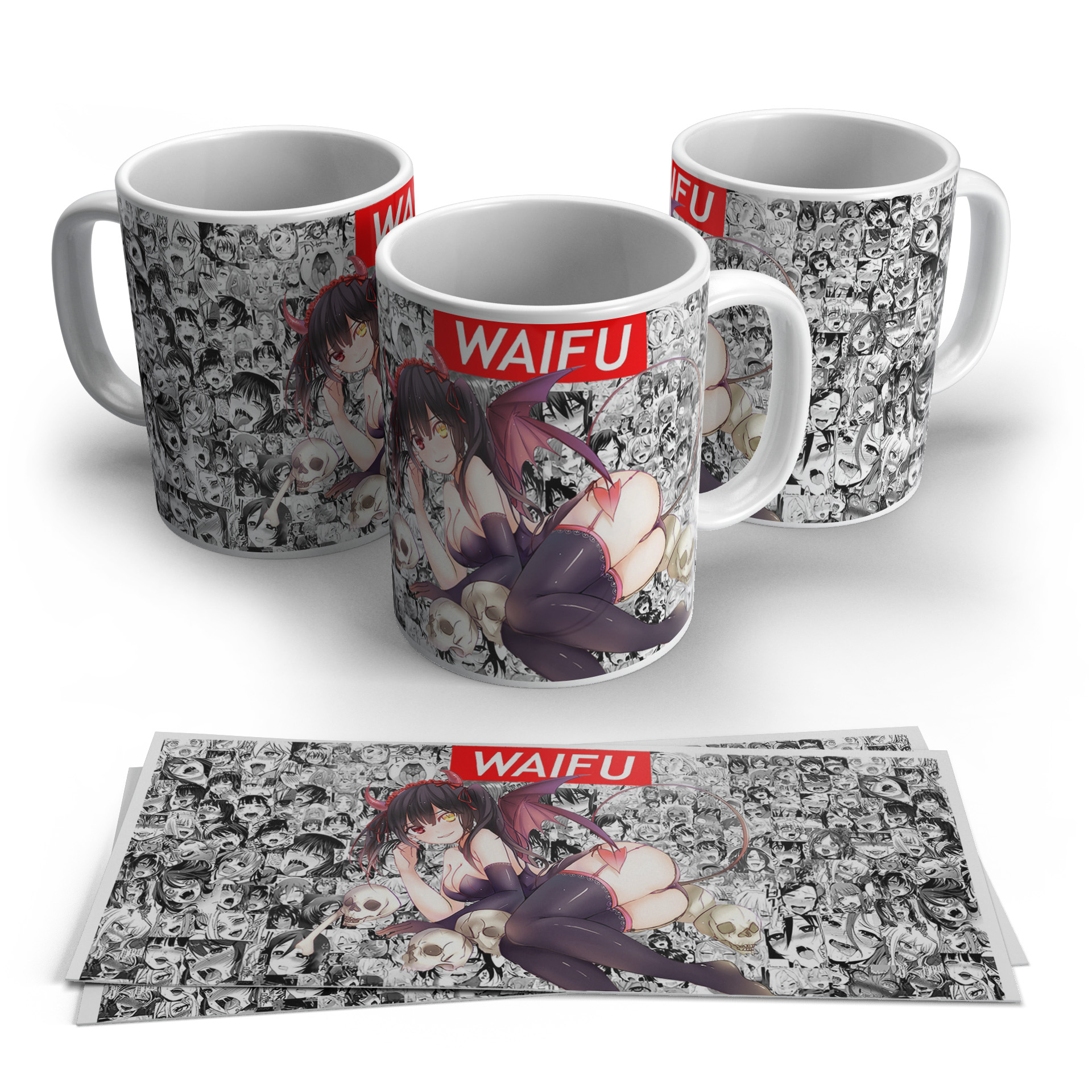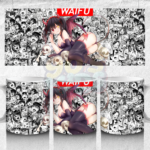 This mug shows a dark themed waifu design with a unique devil look. The manga collage in the background adds depth and makes the design more interesting. A great option for fans who like bold and edgy anime styles.