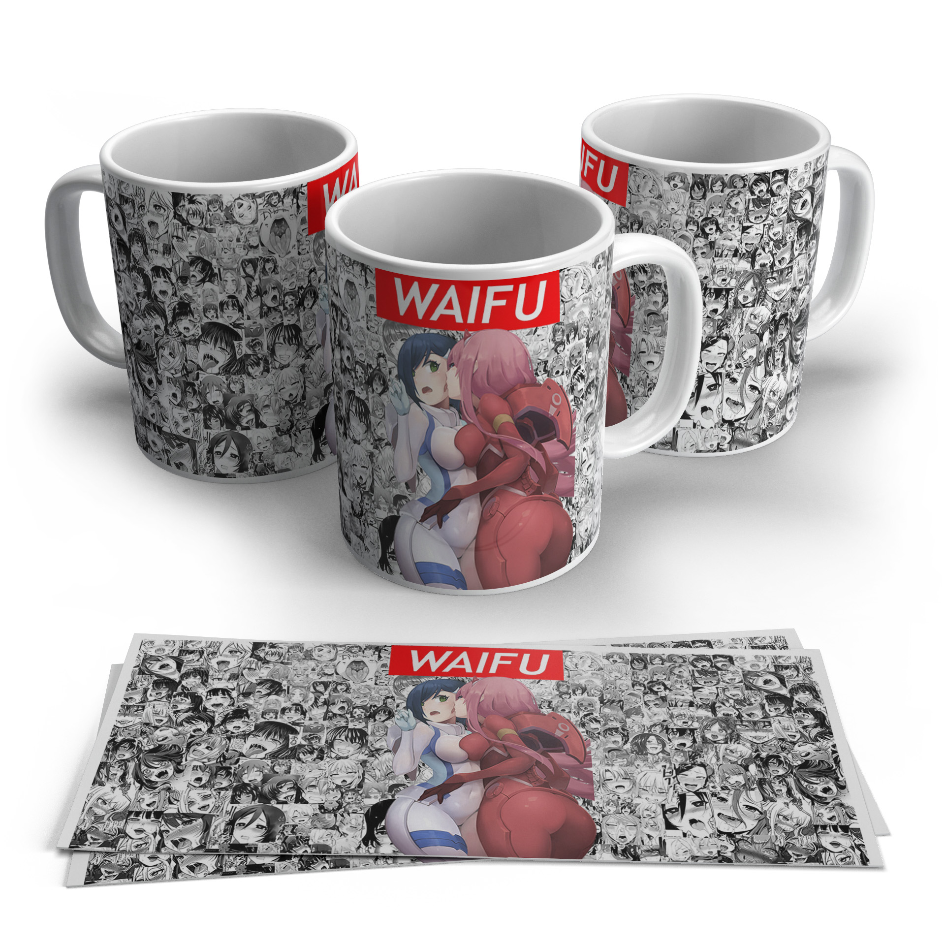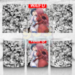 A unique anime mug featuring two waifu characters with a strong visual contrast against a manga collage background. The design gives a mix of classic and modern anime style, making it eye-catching and different from regular prints.