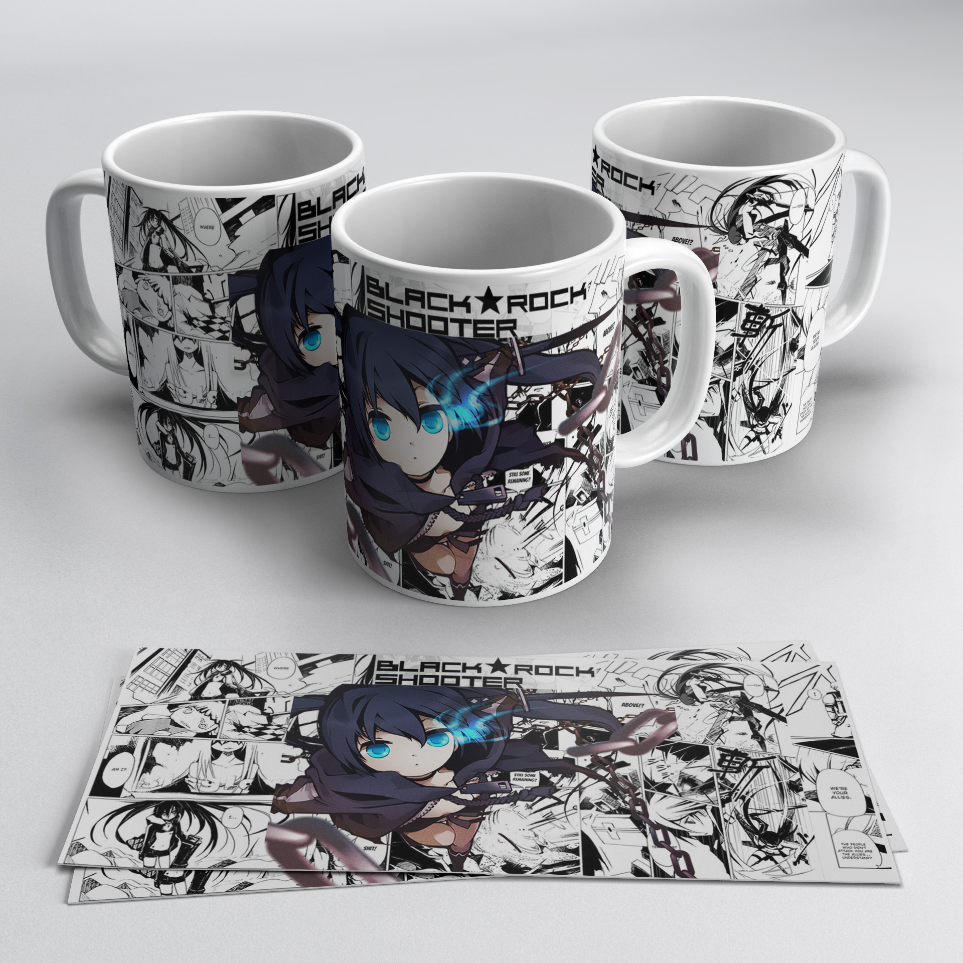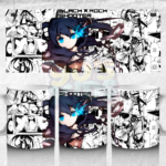 This Black Rock Shooter mug shows a cool blue flame eye design with a dark anime theme and manga background, giving it a unique and stylish look. It is perfect for daily use and a great choice for fans who love powerful and aesthetic characters.