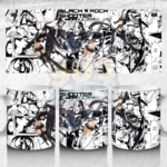 This Black Rock Shooter mug shows a multi-character action design with a manga background, creating a powerful and stylish anime look. It is perfect for daily use and a great choice for fans who love detailed and dynamic artwork.
