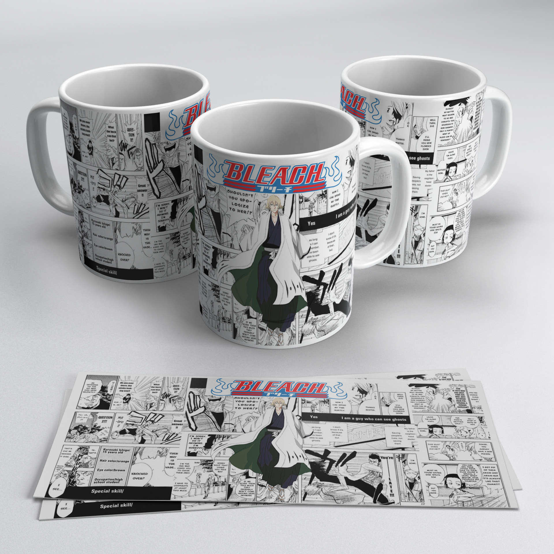 This Bleach mug showcases Kisuke Urahara with a cool and minimal anime design combined with manga panel background for a classic look. It is perfect for daily use and a great pick for anime lovers and collectors.
